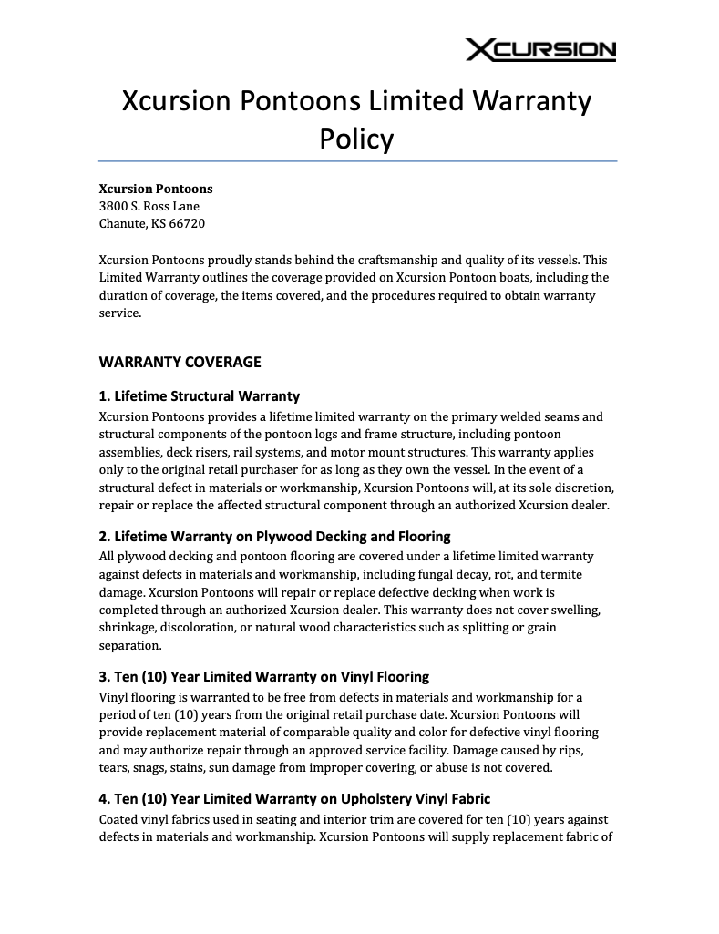Xcursion Pontoons proudly stands behind the craftsmanship and quality of its vessels. This Limited Warranty outlines the coverage provided on Xcursion Pontoon boats, including the duration of coverage, the items covered, and the procedures required to obtain warranty service.